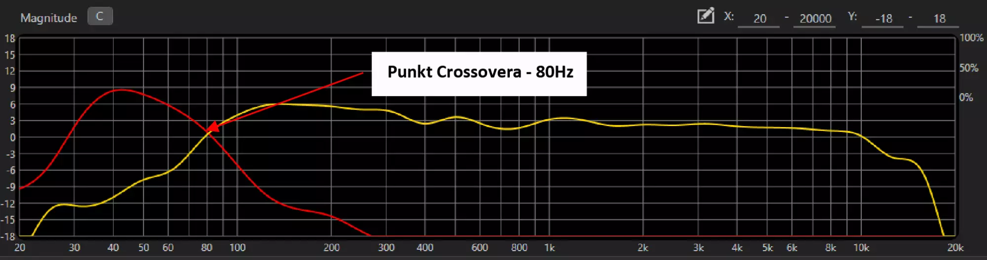 Ustawiamy presety crossovera w subwooferach i klastrze na 80Hz a następnie przechwytujemy ślad magnitudy klastra.
