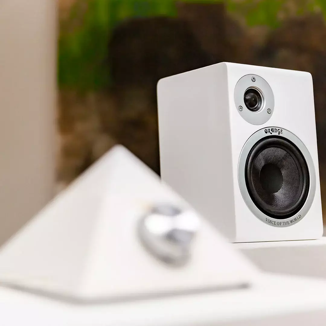 Kompletny system audio Pyramid zawiera parę głośników Orange Voice of the World.