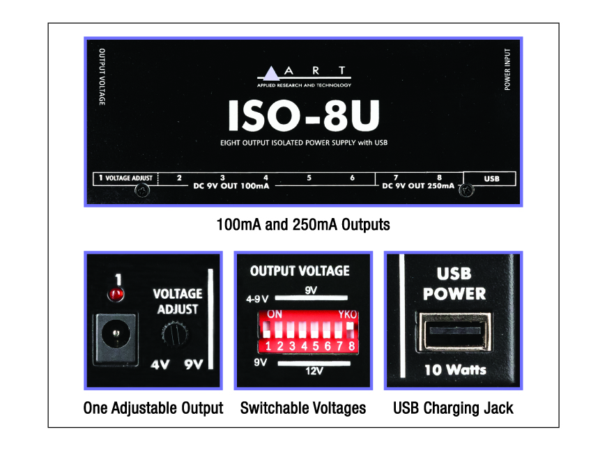 Każde z 8 izolowanych wyjść (eliminacja pętli mas) ma możliwość wyboru napięcia pomiędzy 9V a 12V. Dodatkowo na pierwszym wyjściu mamy możliwość płynnej regulacji napięcia od 4 do 9V dzięki czemu możemy symulować rozładowującą się baterię. Do dyspozycji mamy 2 wyjścia o wysokiej mocy, które mogą dostarczyć 250mA, a pozostałe 6 wyjść zapewniają 100mA.