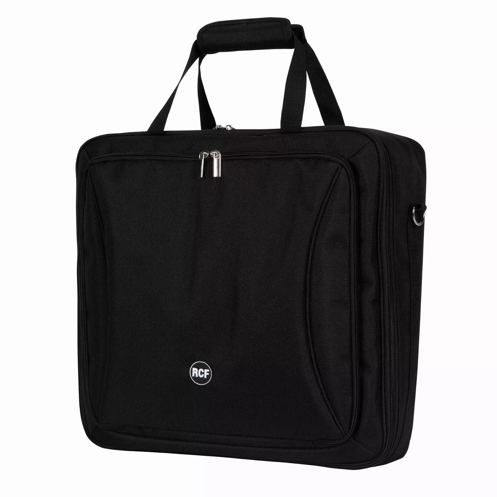 Wyściełana torba do mikserów RCF F 16XR z rączką i paskiem na ramię. Szeroka kieszeń przednia z oddzielną przegrodą na tablet lub inne akcesoria.