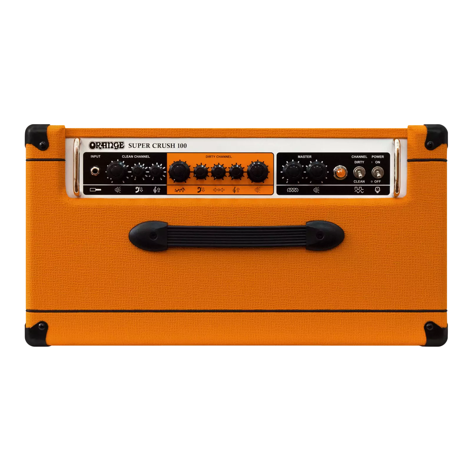 Kanał Dirty może pochwalić się czterema kaskadowymi stopniami właściwego wzmocnienia Orange, wraz z pasywnym 3-pasmowym EQ. Podobnie jak jego w pełni lampowi koledzy, kanał Dirty wzmacniacza Super Crush 100 potrafi wydobyć z siebie ciężkie brzmienia, a także je wyczyścić, niezależnie od tego, czy używasz gałki głośności gitary, czy szerokiej regulacji wzmocnienia wzmacniacza.